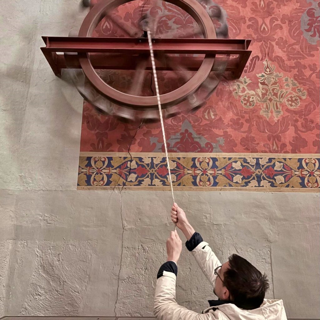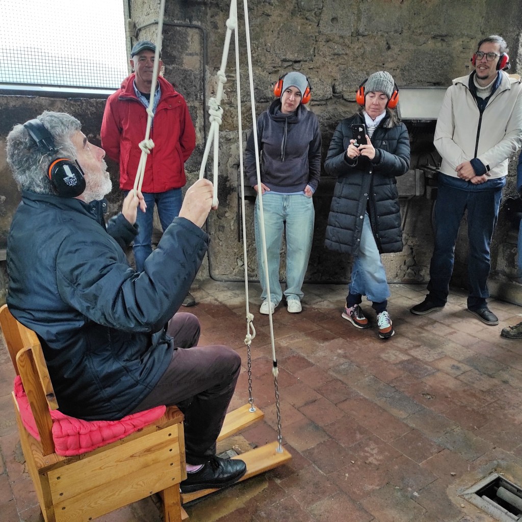 La visita va culminar al campanar, on els participants van descobrir el funcionament de l’antic rellotge de torre, la matraca i el conjunt de campanes litúrgiques. Finalment, van poder provar la cadira de campaner, un sistema tradicional que permet tocar quatre campanes alhora: dues amb les mans i dues amb els peus mitjançant uns pedals.