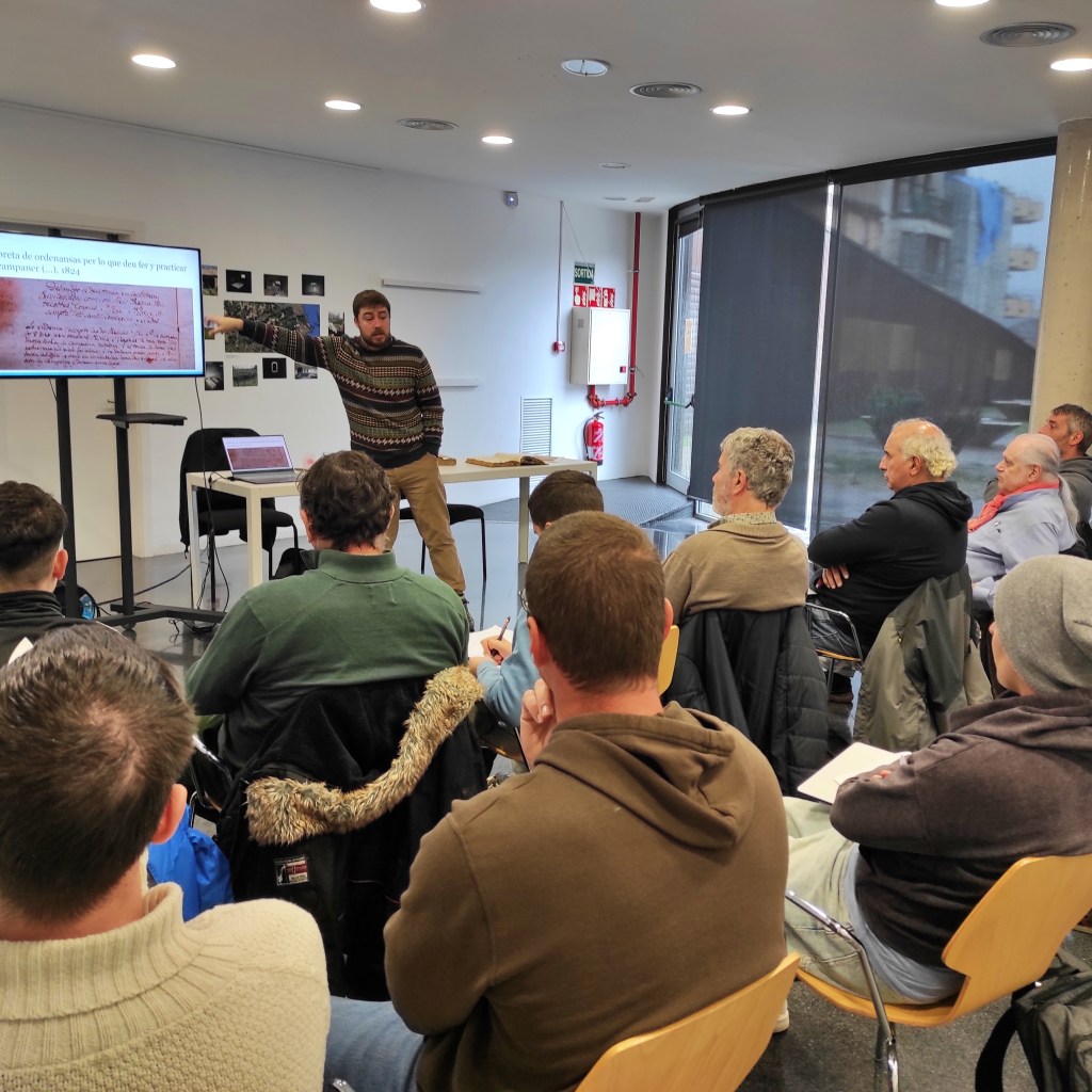 La jornada va començar amb la part teòrica a la sala d’actes de l’Arxiu Comarcal de la Garrotxa. La sessió va anar a càrrec de l’historiador i tècnic arxiver de la catedral de Barcelona, Nil Rider, que va explicar com es documentaven tradicionalment els tocs de campanes. Els alumnes van poder consultar diverses consuetes dels segles XVIII i XIX conservades a l’arxiu, uns documents que descriuen els diferents tocs i les tasques que desenvolupaven els campaners en la vida quotidiana de les esglésies.